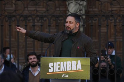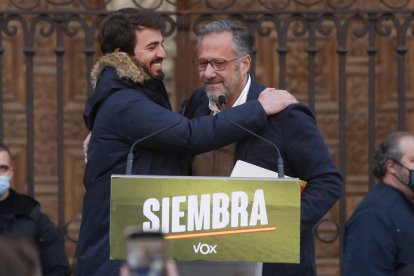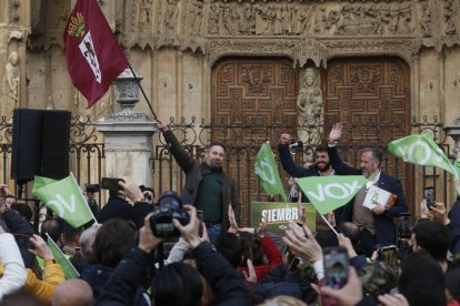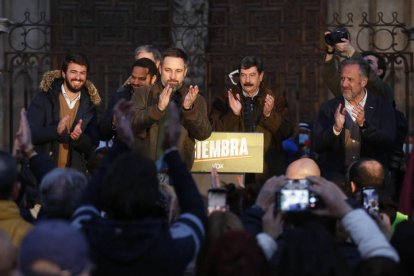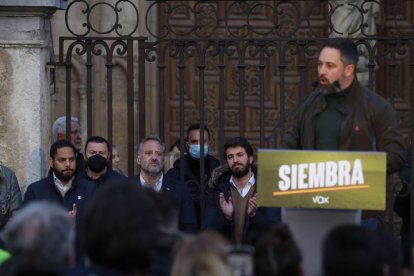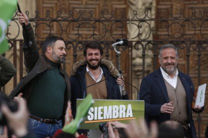 El discurso de Vox y de su líder nacional, Santiago Abascal, retumbó junto a los muros de la Pulchra Leonina. Le acompañó el candidato a presidir la Junta por esta formación, Juan García-Gallardo, y el cabeza de lista por León, Carlos Pollán. La Catedral, la bandera de León y la ideología propia de la formación verde sembraron la plaza de la Catedral en el final de campaña para las elecciones en Castilla y León.
