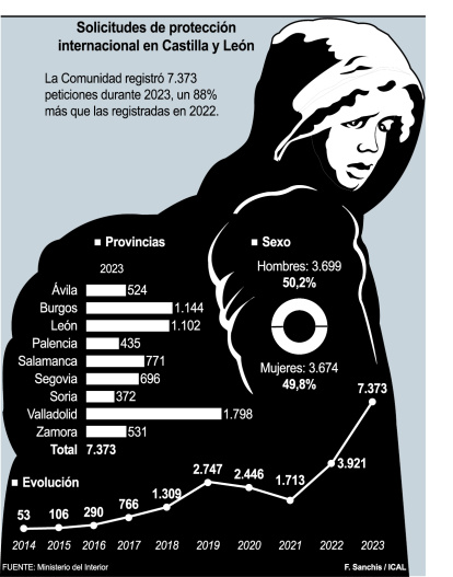 Castilla y León registró el pasado año un total de 7.373 solicitudes de protección internacional, un 88 por ciento más que en 2022, cuando se alcanzaron las 3.921, y la cifra más alta de toda la serie histórica. Al igual que en el conjunto de España, el crecimiento en los últimos años ha sido exponencial, dado que hace diez años en la Comunidad sólo se tramitaron 53 solicitudes. En este último decenio un total de 20.724 migrantes, la mayoría de Ucrania, Venezuela y Colombia, han reclamado este derecho en la Comunidad.