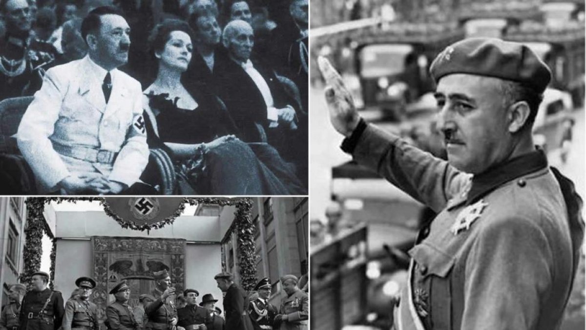 La actriz y espía rusa de origen alemán Olga Chejova (familia del célebre escritor Antón Chéjov), sentada junto a Hitler; debajo, el barón Von Richthofen, coronel de la Legión Cóndor (el más alto); y Franco en 1939, cuando viaja a León para despedir a la Legión Cóndor, que partirá de la ciudad rumbo a Vigo para embarcarse con destino al puerto de Hamburgo