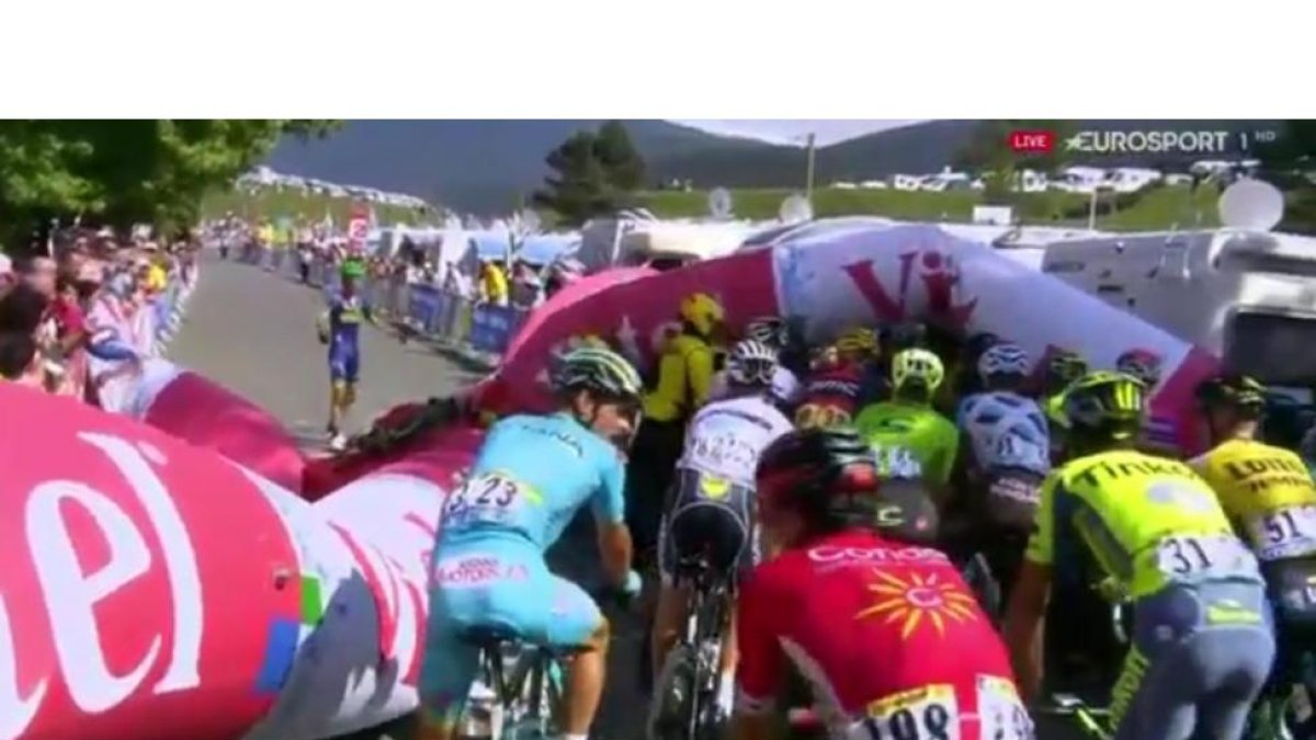 El arco, que se sostiene con una plataforma hinchable, se desinfló cuando pasaba el británico del Orica Adam Yates, que sufrió una herida en la cara.