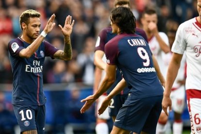 Neymar y Cavani se abrazan tras el gol de penalti del brasileño ante el Girondins.
