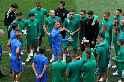Hervé Renard, en el centro, da una charla a los jugadores de la selección marroquí