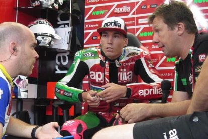 Aleix Espargaró conversa con el técnico de Michelin y su ingeniero de Aprilia, antes del primer entrenamiento de hoy, en el trazado de Spielberg, donde se celebra el Gran Premio de Austria de MotoGP. / EMILIO PÉREZ DE ROZAS