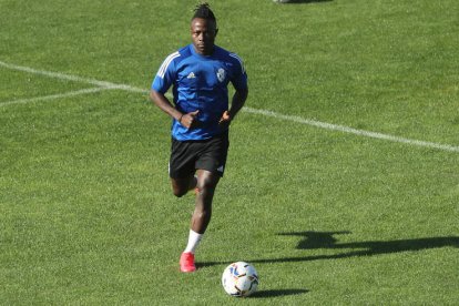 Moussa Sibidé, durante el entrenamiento realizado ayer por la Ponferradina. L. DE LA MATA
