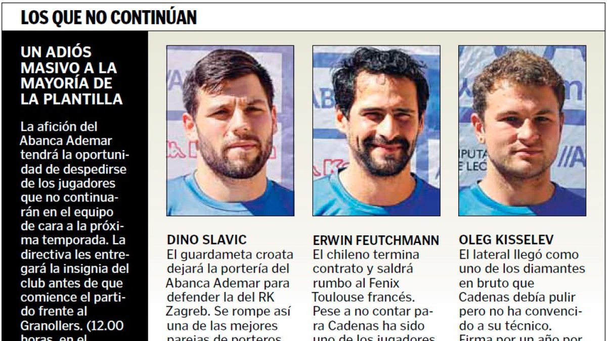 Hasta casi una docena de jugadores protagonizarán su ‘último baile’ con la camiseta del Abanca Ademar este sábado en el partido frente a Granollers. Un éxodo masivo que renovará la plantilla casi por completo de cara a la 2021-22 —ya se han cerrado siete fichajes y al menos llegarán otros tres o cuatro más— y que llega motivado, en parte, por los descartes de Cadenas pero también por el interés que han generado en otros clubes algunas de las principales estrellas del equipo. Es el caso de referentes como Rubén Marchán, Tin Lucin o Natán Suárez, aunque estos dos últimos —que recalarán en Wisla Plock y Sporting de Lisboa, respectivamente— tengan contrato en vigor.
