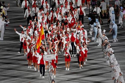 Alegres y contenidos, impecables en su vestimenta, con tímidos saltos, algún corazón formado con los dedos y muchos móviles para inmortalizar el momento, España desfiló en la apertura de los Juegos Olímpicos de Tokio 2020 abanderados por la nadadora Mireia Belmonte y el piragüista Saúl Craviotto.