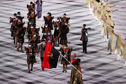 La bandera de Guinea, país que anunció que no participaría en los Juegos debido a la pandemia, fue portada por un voluntario, lo mismo que la de Tanzania.