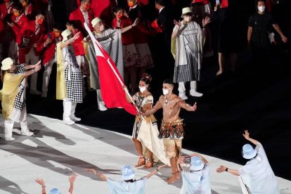 El abanderado de Tonga, Pita Taufatofua, volvió hoy a presentarse a pecho descubierto y generosamente embadurnado en aceite en la inauguración de unos Juegos Olímpicos, los de Tokio 2020, en los que esta vez contó con un competidor.