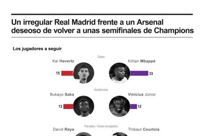 Un irregular Real Madrid, tocado y herido en su orgullo tras perder contra el Valencia, se enfrenta al Arsenal, acribillado por las lesiones y con el sueño y el deseo de volver a unas semifinales de la Liga de Campeones, dieciséis años después. EFE/infografía
