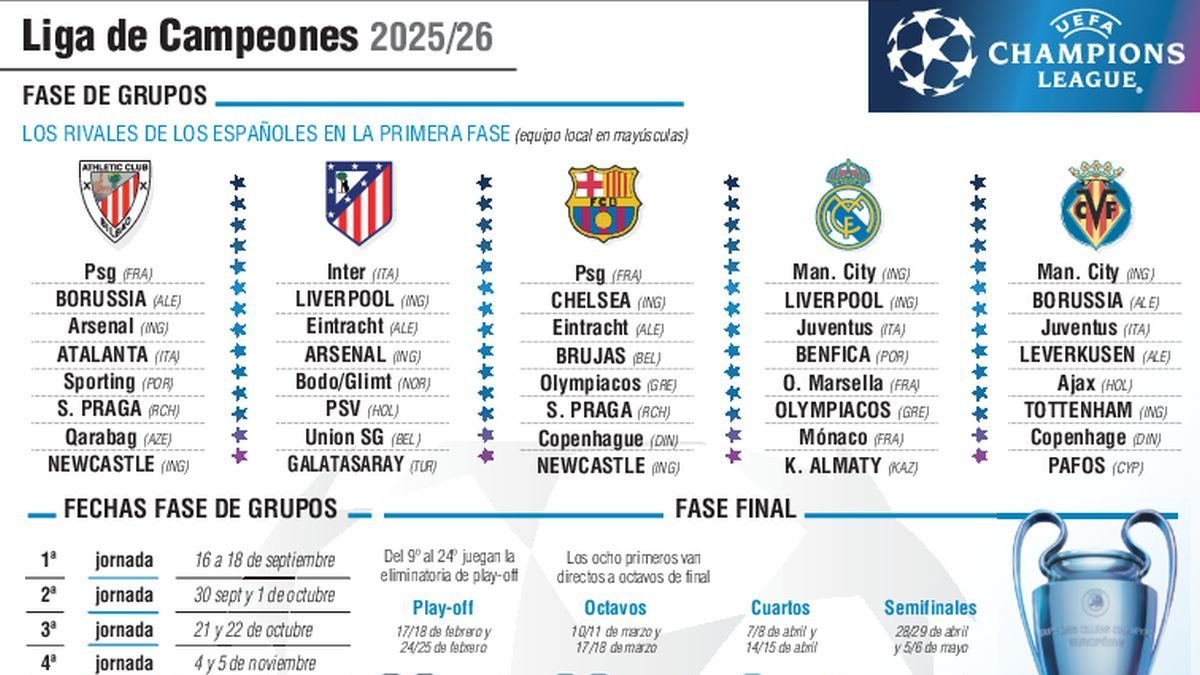 El sorteo de la fase de grupos de la Liga de Campeones, celebrado este en el Foro Grimaldi de Mónaco y que tuvo a Kaká y a Zlatan Ibrahimovic como ‘manos inocentes’, mostró su lado más cruel con el Real Madrid, que deberá superar un trayecto lleno de minas con Liverpool, Manchester City y Juventus como principales adversarios, además de afrontar un interminable desplazamiento a Kazajistán para verse las caras con el Kairat Almaty, y resultó más amable para el Barça, que afrontará como principales escollos a PSG, en casa, y a Chelsea y Newcastle, a domicilio, pero no debería tener problemas para salir bien parado de una fase de liga en la que Brujas, Olympiacos, Slavia de Praga o Copenhague aparecen como adversarios teóricamente propicios para los de Hansi Flick.