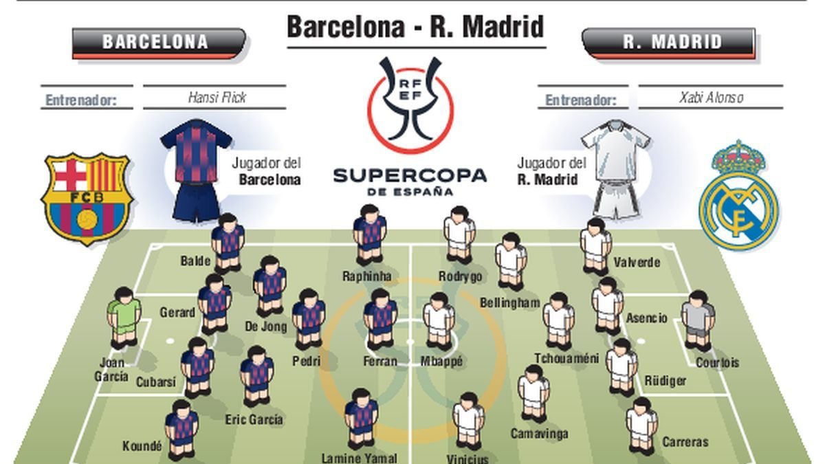 Llega el Barça a la final tras haber goleado al Athletic en semifinales (5-0). Y sin Lamine Yamal de inicio, debido a problemas estomacales. Demostración de poderío de los de Flick, que esperan trasladar al Clásico en busca del título y de la revancha del único precedente de la temporada, en el que perdieron en Liga. Intentará el Barcelona alargar su dominio en España, tras ganar Liga, Copa y Supercopa la pasada temporada. Lamine volverá al once titular, con Raphinha en el costado izquierdo y la primera duda de Flick: darle la tercera titularidad a Ferran o devolver al once a Lewandowski.
