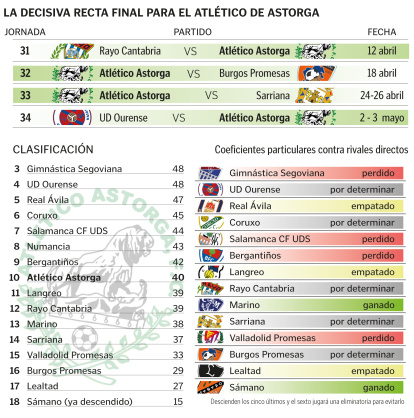 El primer examen para los maragatos será el domingo 12 en el feudo de un Rayo Cantabria al que los verdes aventajan en un punto y con el que empataron en la primera vuelta en La Eragudina. Los santanderinos son el último equipo que a falta de cuatro jornadas marca la barrera entre la salvación y la condena, lugar este último que para el Atlético Astorga se encuentra a tres puntos (uno menos con el peldaño que obligaría a jugar a priori una eliminatoria de permanencia).