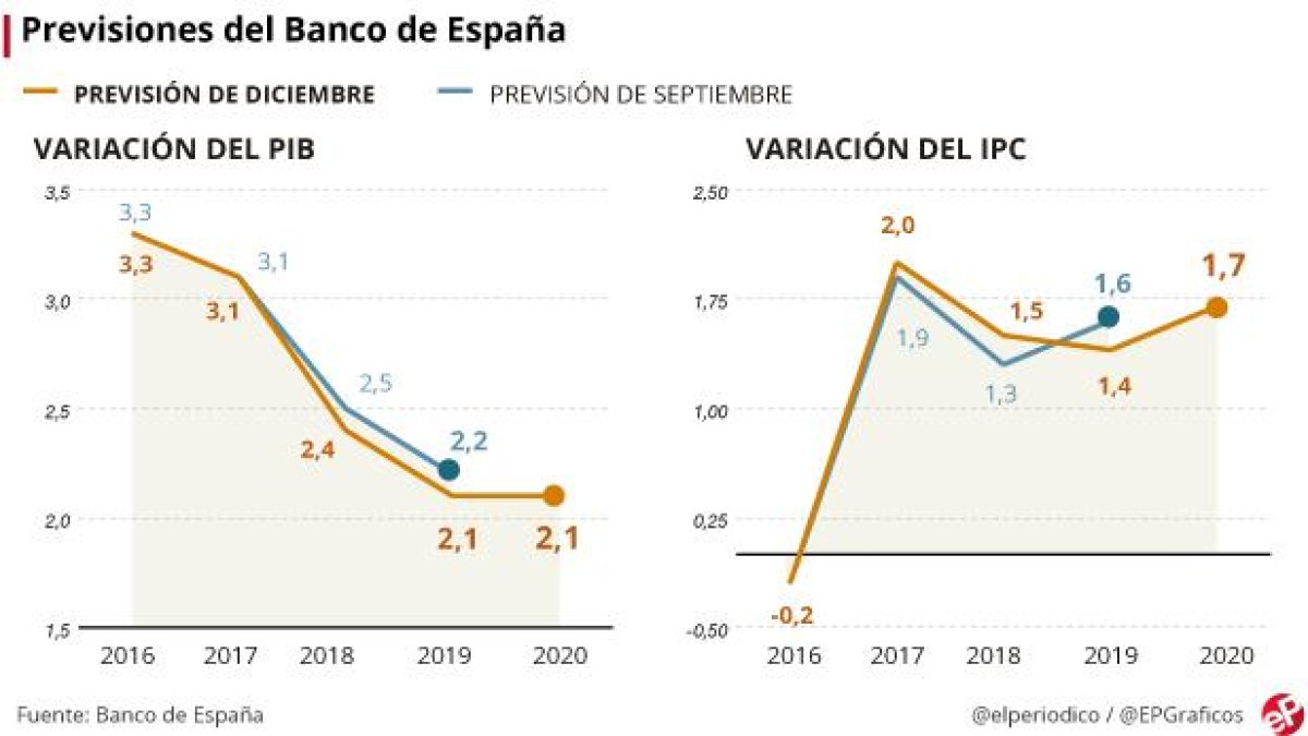De momento, con la nueva información recopilada hasta la última semana de noviembre, el organismo que preside Luis María Linde ha revisado a la baja algunas de las previsiones que publicó en septiembre. Respecto al 2017, el Banco de España mantiene su previsión de un crecimiento del producto interior bruto (PIB) del 3,1%. Para el 2018 y el 2019 el crecimiento se revisa ligeramente a la baja, hasta el 2,4% y el 2,1% (desde el 2,5 % y 2,2 % anteriores), “como consecuencia del aumento de la incertidumbre asociada a la situación en Cataluña”. El informe incorpora por primera vez el 2020 en su horizonte de previsión, con una estimación del 2,1%.