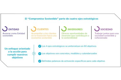 En segundo lugar, acompañar a los clientes en la transición hacia una economía sostenible, promoviendo soluciones en energías renovables, eficiencia energética y movilidad sostenible. Y ello poniendo encima de la mesa 65.000 millones de euros en soluciones de finanzas sostenibles de 2021 a 2025, además una oferta del 50% de vehículos con ecoetiqueta en 2025.
