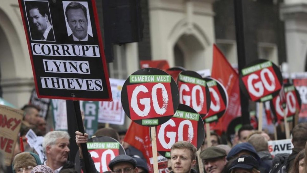 Los manifestantes portaban pancartas en las que se leían lemas como "Cameron se debe marchar", "'Tories' fuera", al tiempo que reclamaban a gritos un cambio en sus políticas de sanidad y educación, el mercado laboral y el acceso a la vivienda.