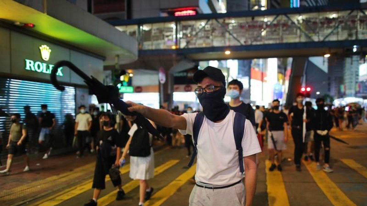 Estaciones de metro selladas, comercios y bancos de propiedad china destrozados y enfrentamientos con la Policía es el resultado de la caótica noche-madrugada que vivió Hong Kong, ahora prácticamente paralizada tras las protestas contra la ley que prohíbe el uso de máscaras en manifestaciones. Más de un millar de personas retaron con sus máscaras la decisión de la Jefa del Ejecutivo, Carrie Lam, de invocar una ordenanza de la época británica para aprobar su ley contra las máscaras. | efe