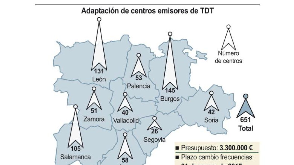 La Consejería de Fomento y Medio Ambiente acelera la pasos para adaptar unos 600 centros emisores que llevan la señal de la Televisión Digital Terrestre (TDT) a miles de castellanos y leoneses debido a los cambios que introducirá el dividendo digital, que liberará ancho de banda para la tecnología 4G. Para ello, cuenta con un plan técnico dotado con 3,3 millones, que engloba varios contratos que está licitando para que los trabajos estén listos antes del 31 de marzo, fecha en la que se apagarán algunas frecuencias.