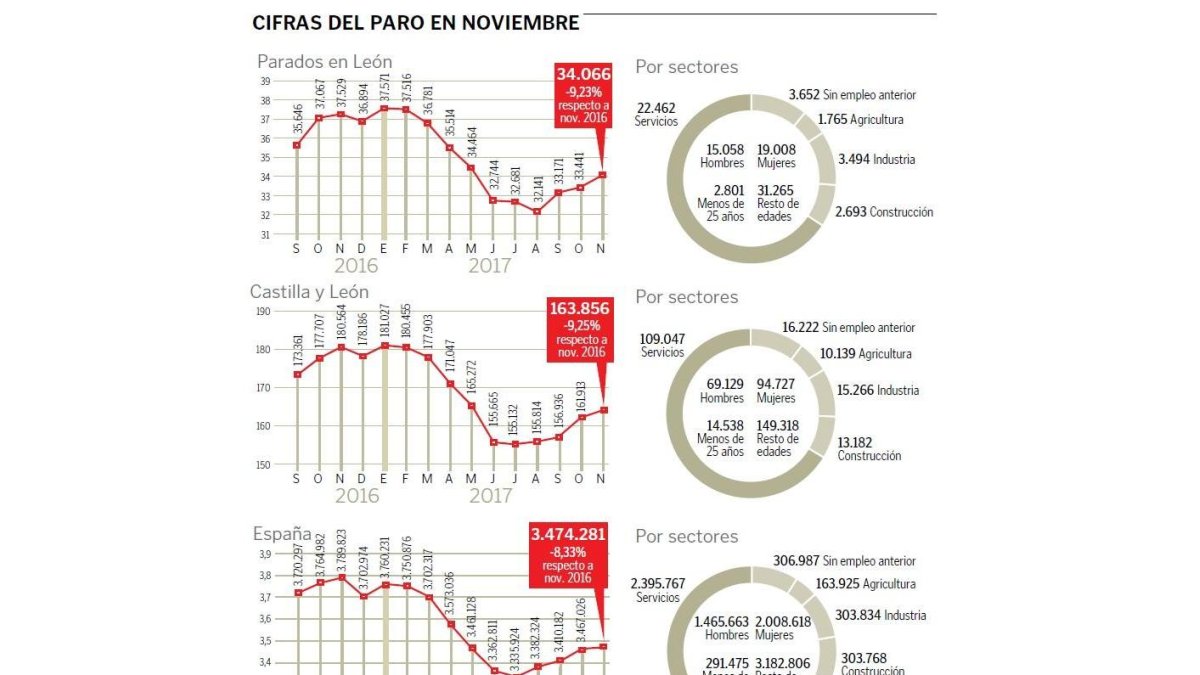 Recogiendo los coletazos del fin de la temporada veraniega y antes de que se concreten los contratos del empujón del consumo navideño. Noviembre deja en todo el país, también en León, un aumento mensual del número de parados registrados en los servicios oficiales, y también de destrucción de empleos entre los cotizantes a la Seguridad Social. Pero la evolución va dibujando también una línea clara de la evolución de los distintos sectores de actividad.