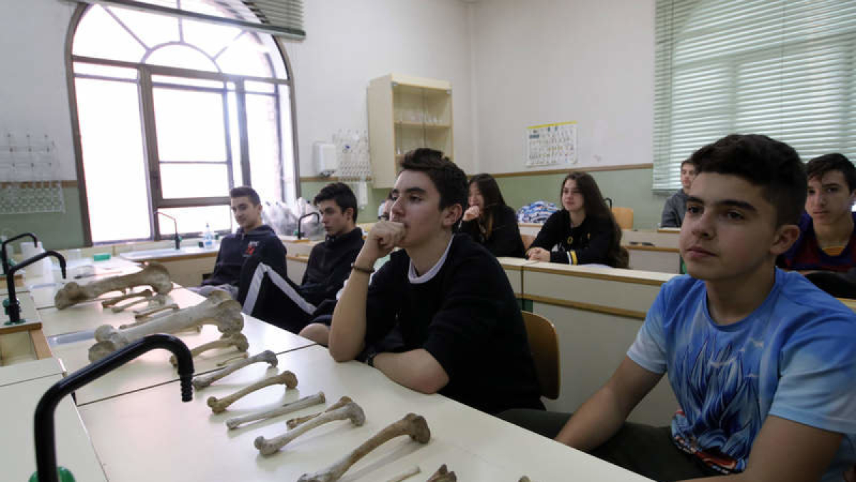 Los alumnos del instituto Claudio Sánchez Albornoz se enfrentaron ayer nada más entrar al laboratorio a más de dos decenas de huesos, algunos de ellos fósiles. La mayoría eran fémures de animales, aunque lo primero que tenían que hacer era diferenciarlos de aquellos que no pertenecían a esta parte del cuerpo y, después, separar los que eran de animales carnívoros de los que no lo eran. El investigador de la Universidad de León Darío Fidalgo Casares les dio la clave, unos pequeños huesecillos (y la marca que dejaban en el fémur) a la altura de la rodilla y una protuberancia que indicaba claramente que se trataba de carnívoros. Bajo esta base, los alumnos se pusieron a trabajar manejando con sus manos los huesos, tocándolos y midiéndolos. «Los huesos pesan, pero los fósiles más, porque durante el proceso se convierten casi o totalmente en roca», explicó Darío Fidalgo ante la atenta mirada de los alumnos y la sorpresa de aquellos que hacían la comparación con sus manos.