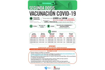 Así, según ha informado este viernes la Delegación Territorial de la Junta, el Palacio de Exposición y Congresos de León acogerá convocatorias masivas del 28 de junio al 2 de julio, en horario de mañana, para las personas nacidas entre los años 1955 y 1968 que fueron inmunizadas con la primera dosis del 12 al 16 de abril.