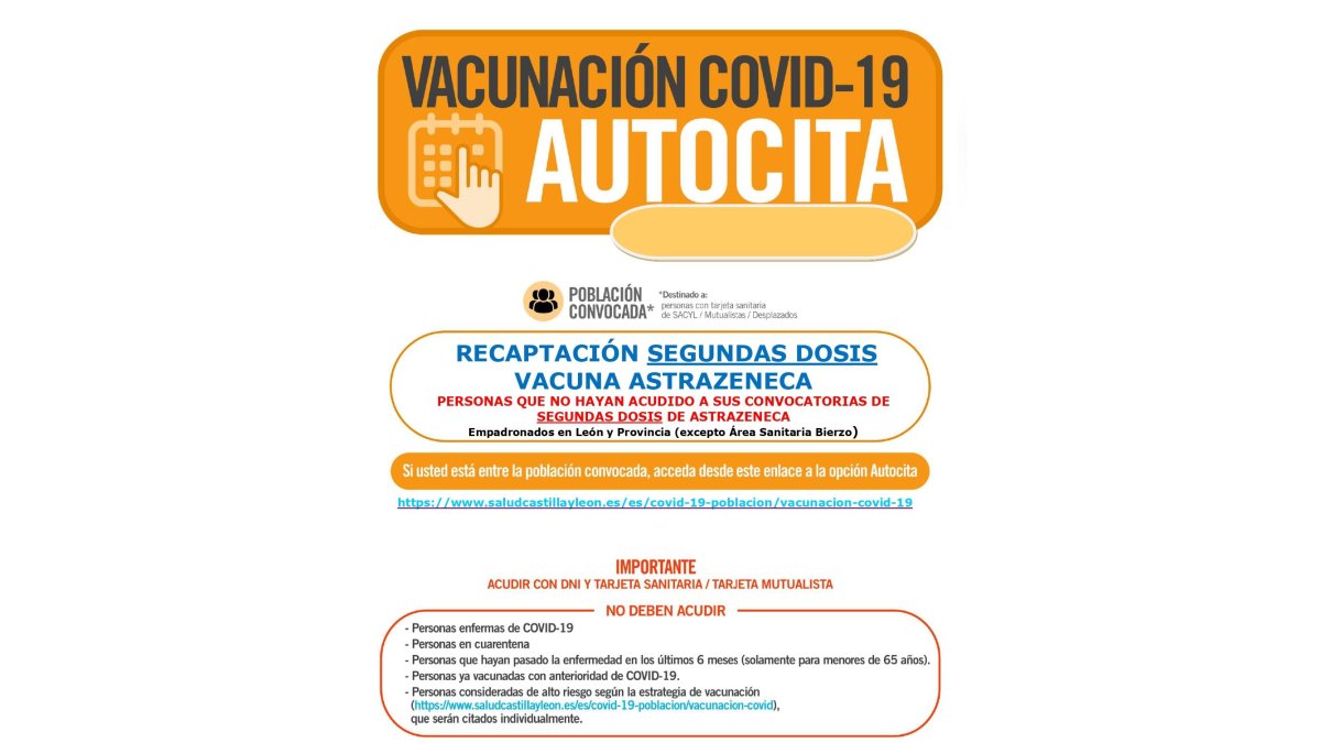 Haz clic para ampliar Ya está abierta la vacunación por autocita destinada a la recaptación de segundas dosis de la vacuna AstraZeneca. Para acceder a la cita, se deberá hacer mediante el siguiente enlace: https://www.saludcastillayleon.es/es/covid-19-poblacion/vacunacion-covid-19. Podrán pedirla todas las personas empadronadas en León y provincia, excepto los que pertenezcan al Área Sanitaria del Bierzo.