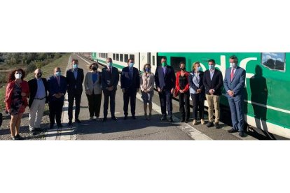 Autoridades locales de León y de Asturias, ayer en La Robla antes de que el tren laboratorio partiese hacia Campomanes. Á.C.