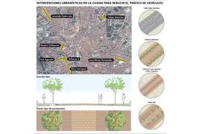 En este listado de intervenciones se apuntan Alfonso V, Gil y Carrasco y San Agustín, con un presupuesto de 1.436.328,12 euros; Ramiro Valbuena, para el que se destinarán 639.467,20 euros, Felipe Sánchez, en el barrio de La Palomera, donde se emplearán 616.813,67 euros; José María Fernández, con 312.329,02 euros; y el tramo de Padre Isla que se identifica con el antiguo 18 de julio, donde el presupuesto alcanza los 1.181.967,32 euros. En todos ellos se hará una "plataforma única", sin diferencia entre las aceras y la calzada, con un nuevo adoquinado, en lugar de asfalto, para contribuir al "calmado del tráfico", como justificó el alcalde, quien insistió en que en las mismas "se mantendrá el aparcamiento como está y la circulación".