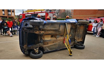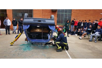 Una dotación de bomberos del Ayuntamiento de León realizó hoy un simulacro de extracción de víctimas en accidente vial con atrapados en el Instituto de Educación Secundaria Giner de los Ríos de la capital. Concretamente asistieron alumnos de Formación Profesional de Emergencias Sanitarias, Carrocería, Electromecánica y Automoción del citado centro.
