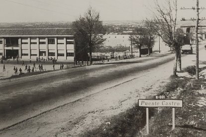 Los chavales juegan al fútbol en el patio del grupo escolar, que fue construido en la entrada de Puente Castro en 1956.