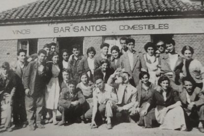 Los jóvenes posan ante el Bar Santos en 1956 durante las celebraciones de la Fiesta de la Protectora en Trobajo del Cerecedo.