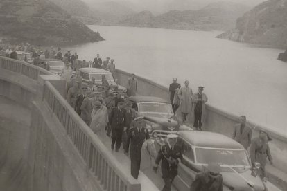 La comitiva que acompañaba a Franco se detiene en lo alto de la presa durante la inauguración del Pantano de Luna el 24 de septiembre de 1956, construido por presos políticos.