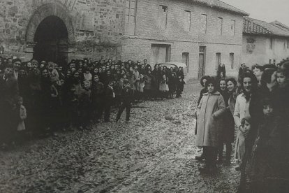 Fiesta del Sagrado Corazón de Jesús en Ambasaguas de Curueño el 5 de junio de 1955. El pueblo entero se fotografió el día que ocho niños hicieron la Comunión.