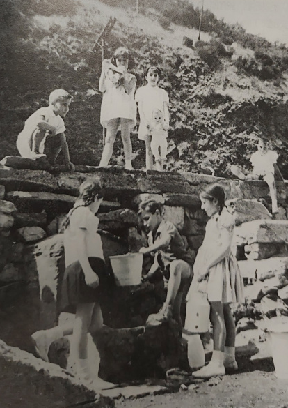Los niños de Ciñera acarrean agua para las casas en el verano de 1955. Con el caldero, Antonio Valbuena.