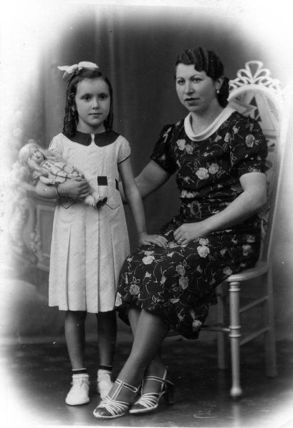 Mujer y su hija posan durante los años 50 con indumentarias propias de la época.
