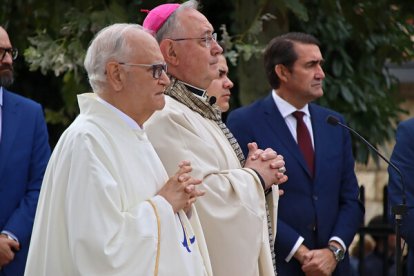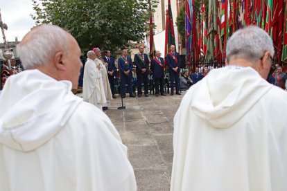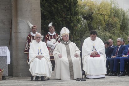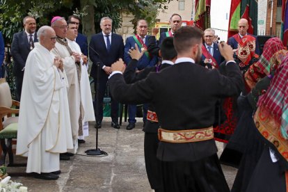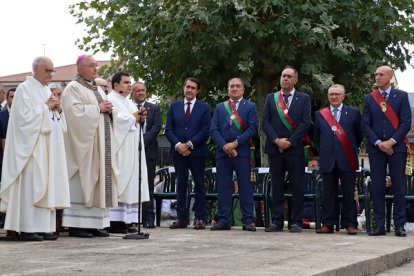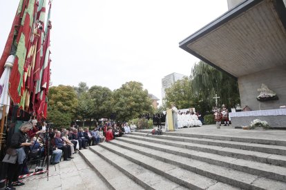20 minutos antes de la hora de la misa, llegó la corporación de León en pleno. Los Ayuntamientos del voto y el resto de los de la provincia ya estaban a pie de obra. la solemnidad de la misa, en estos casos se viene a menos. El jolgorio y la algarabía exterior puede más que el rito, celebrado en el exterior del santuario.