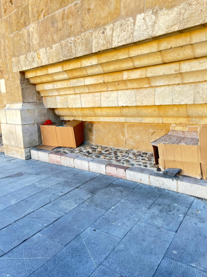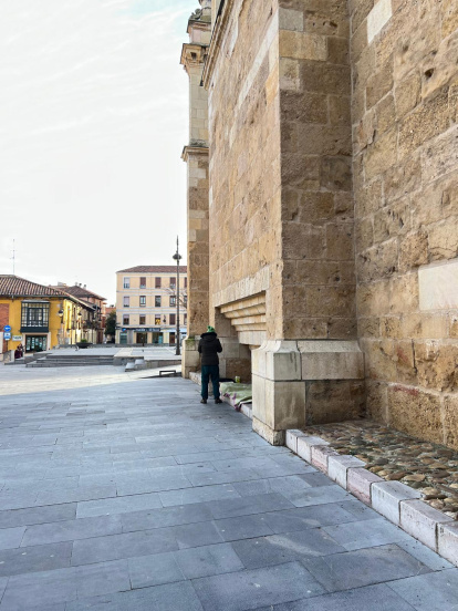 El panorama humano que se observa en la fachada trasera de la Catedral de León resulta desolador. Al menos dos personas pernoctan a diario entre cartones encajados en los bajos del templo, tras haber sido desplazados de otras zonas de la ciudad.