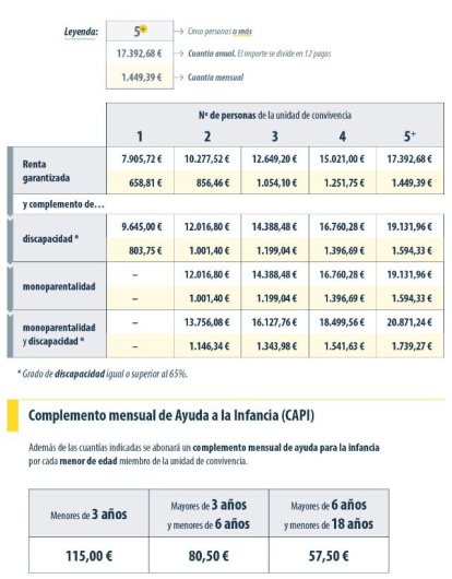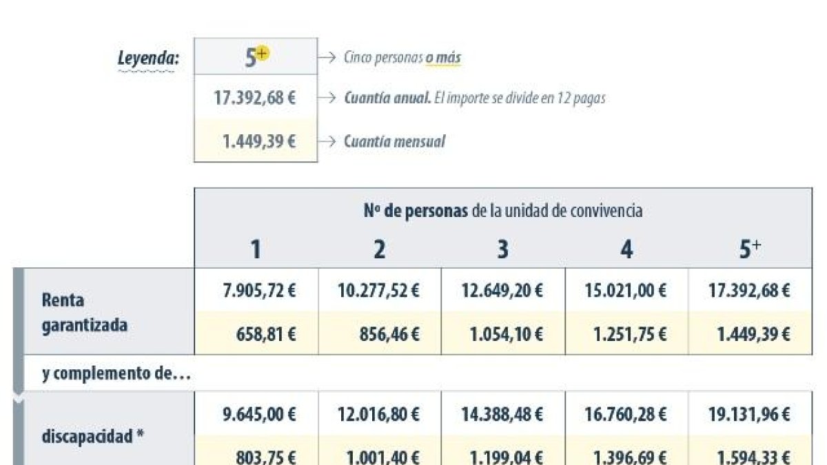 - En el caso de una unidad de convivencia, su renta garantizada se incrementa en un 30% por cada miembro adicional. Sin embargo, a partir de 5 miembros la cantidad deja de aumentar, por lo que la renta garantizada de la unidad de convivencia no puede superar el 220% de una renta individual. Por lo tanto, para una unidad de 5 miembros o más, la renta garantizada será de 17.392,68 euros anuales, o 1.449,39 euros mensuales.