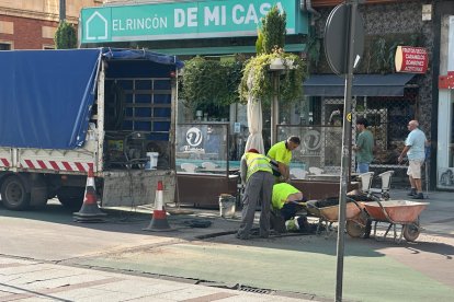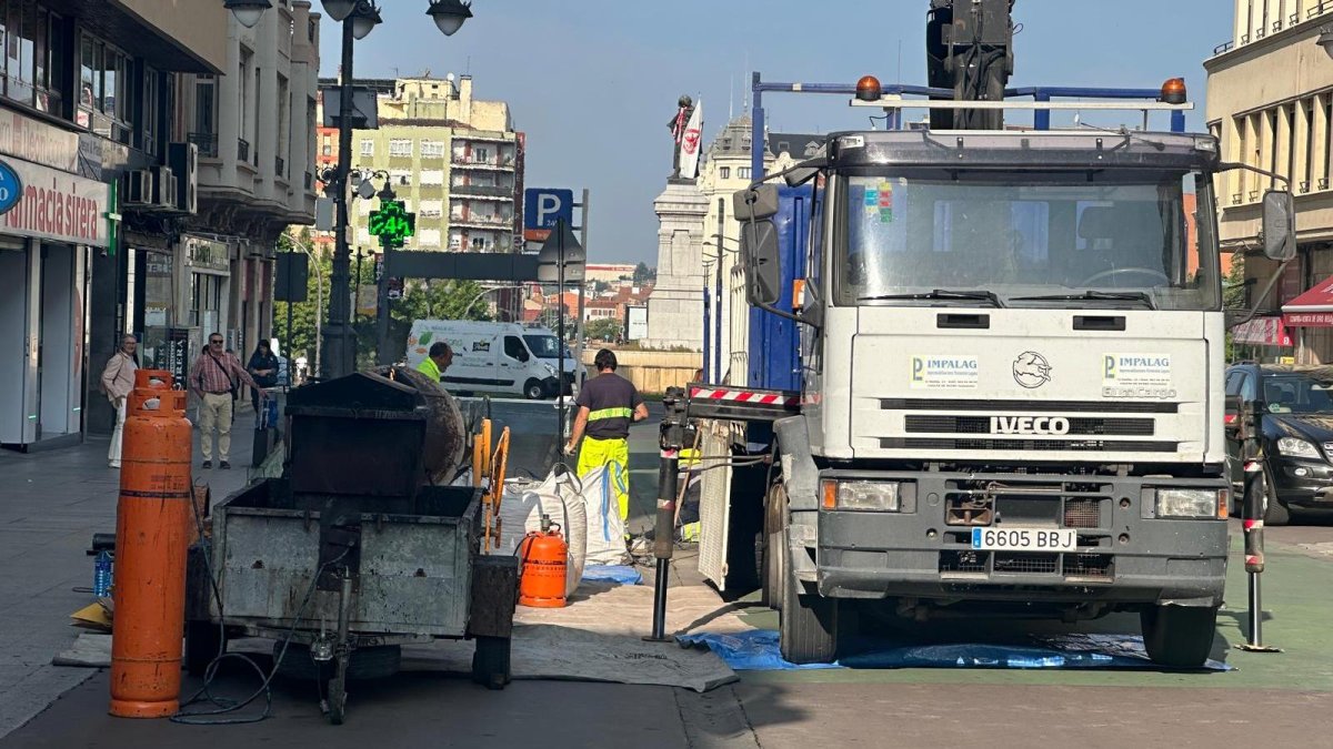Varios operarios trabajan desde primera hora de este lunes en la reparación de las grietas y desperfectos de Ordoño II, una intervención que lleva meses pendiente y que tenía el 18 de marzo como fecha tope para que el Ayuntamiento solicitase a la adjudicataria de la semipeatonalización la reparación de las grietas y desperfectos que han surgido en la calle central de la capital leonesa.