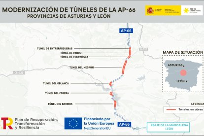 El Ministerio de Transportes y Movilidad Sostenible avanza en la ejecución de las obras de modernización de los túneles de Entrerregueras, Pando, Vegaviesga, Negrón, Oblanca, Cosera y Barrios, situados en la autopista AP-66, entre León y Asturias.