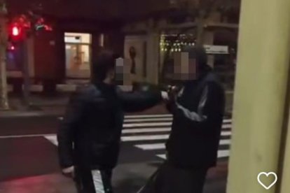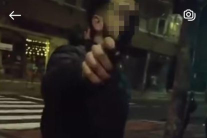 La víctima contesta "No me quiero pegar contigo", a lo que el agresor le responde "Ahora te vas a ir a casa pero después...". "Conozco el barrio y sé quiénes sois", dice el afectado mientras entran en una trifulca y el agresor no para de apartarle la mano al grito de "Deja la mano".