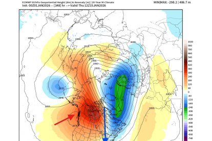 Un mapa de anomalías de geopotencial resalta cómo el vórtice deformado dirige corrientes frías hacia el continente.