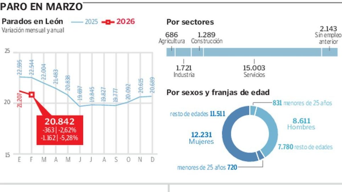 León marcó en marzo un descenso del número de parados inscritos en las oficinas del Servicio Público de Empleo. 363 personas salieron de las listas del dempleo en la provincia de León en el último mes (-1,71%) para reducir la cifra de parados hasta las 20.842 personas. Como ya es habitual en la provincia leonesa, es de nuevo el sector servicios el que copa el mayor descenso del número de parados (-305). Le sigue el sector industrial (-42), construcción (-27) y agricultura (-10). En cuanto a la afiliación a la Seguridad Social, León sumó 1.015 cotizantes más en marzo respecto a febrero, un aumento del 0,60%, alcanzando los 169.881 afiliados, de los que 34.229 son autónomos. Son 2.207 afiliados más que hace un año, lo que supone un incremento del 1,32% anual. A nivel nacional, el paro registrado en las oficinas de los servicios públicos de empleo bajó en 22.934 personas en marzo en relación al mes anterior (-0,9%), casi el doble que en igual mes de 2025, impulsado, fundamentalmente, por el sector servicios, que concentró buena parte del descenso del desempleo, según datos publicados este lunes por el Ministerio de Trabajo y Economía Social. Tras la caída del paro en el tercer mes del año, el número de desempleados se situó en su nivel más bajo en un mes de marzo en los últimos 18 años, con un total de 2.419.712 parados, ha subrayado el Ministerio. El retroceso del paro en marzo de este año es mayor que el experimentado en igual mes de 2025 (-13.311 desempleados), pero inferior a los descensos de marzo de 2024 (-33.405) y 2023 (-48.755). Desde el inicio de la serie histórica comparable en 1996, el paro ha bajado en marzo en 26 ocasiones y ha subido en cinco. El mayor repunte en este mes se produjo con la llegada de la pandemia en 2020, con 302.000 desempleados más, y el mayor descenso fue el de 2002, cuando disminuyó en 66.800 parados. En términos desestacionalizados, el paro registrado bajó en el tercer mes de 2026 en 15.534 personas. En el último año el desempleo acumula un descenso de 160.426 parados, lo que supone un 6,2% menos, con un retroceso del paro femenino de 95.206 mujeres (-6,1%) y una caída del desempleo masculino de 65.220 varones (-6,3%). Por sectores, el paro bajó especialmente en el sector servicios, con 18.852 desempleados menos que en febrero (-1%), seguido de la construcción, que restó 5.846 desempleados (-3,4%), y de la industria, con 1.482 parados menos (-0,8%).