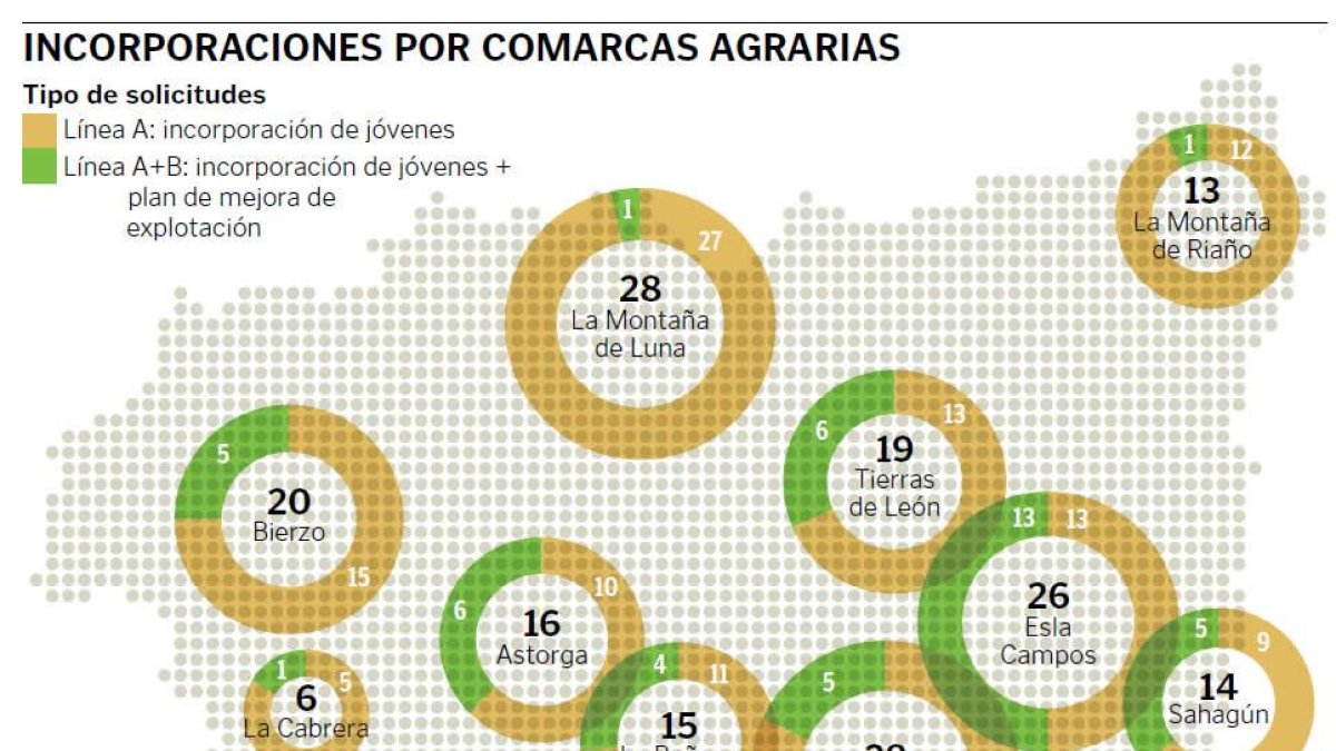 La Montaña de Luna es la tercera comarca agraria de la provincia en extensión, con 202.512 hectáreas, superada por el Bierzo (282.426 hectáreas) y la Montaña de Riaño (241.759). Abarca desde Laciana y el Alto Sil hasta Omaña a la Montaña Central, pero, aunque con 13 términos municipales, no es la que más municipios engloba —apartado que encabezan Esla-Campos y el Bierzo— y sólo La Cabrera, con cuatro, cuenta con menos ayuntamientos. De los 28 expedientes de ayuda que presentó el año pasado, 26 son de incorporación a la actividad ganadera, uno de inicio en la actividad pecuaria y mejora de la explotación y tan solo uno tiene como fin la agricultura. La comarca acapara así el 33% de las incorporaciones a la ganadería en toda la provincia, Con Riaño y Bierzo, con 13 cada comarca, en segundo lugar.