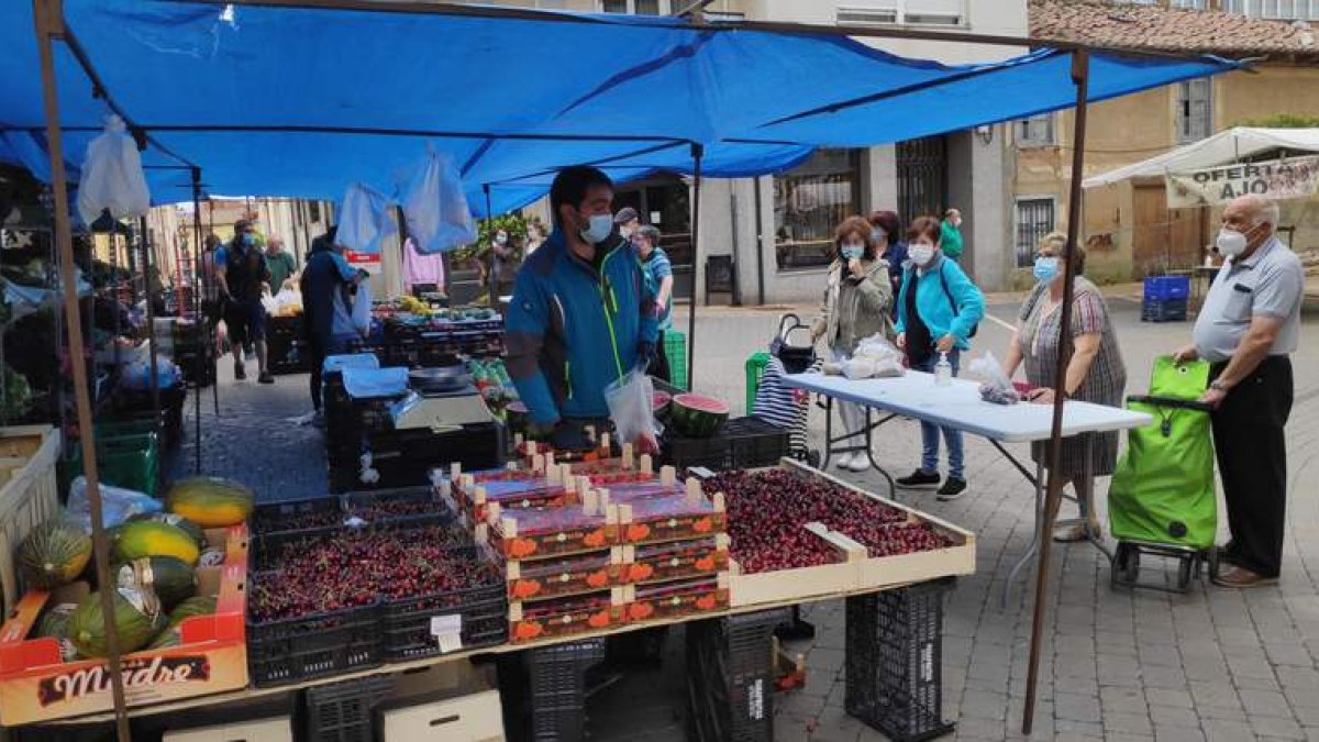 El tradicional mercado de los domingos que llena el centro de la localidad volvió ayer a Santa María del Páramo tras casi dos meses cerrado por la pandemia del coronavirus. Eso sí, de momento, sólo con los puestos de alimentación. La mañana amaneció con lluvia que amenazó con alargar una semana más la instalación de los puestos, pero poco a poco el día fue abriendo y pudo celebrarse con una afluencia de público moderada.
