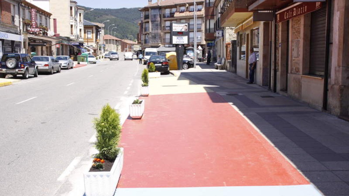 El Ayuntamiento de Boñar ha eliminado varias zonas de aparcamientos en la avenida Madrid prolongando el espacio de las aceras lo que ha permitido destinar este espacio a terrazas que serán ocupado por mesas de los bares contiguos.