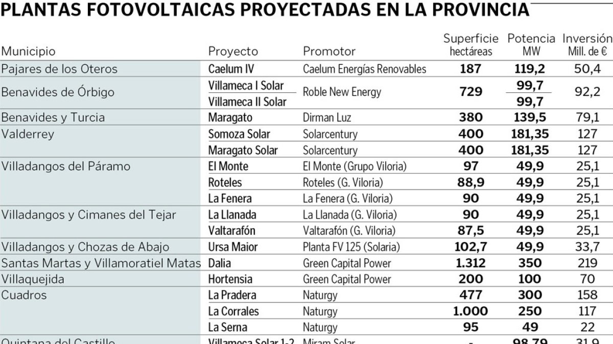 Otras de las plantas solares de gran tamaño están proyectadas para los municipios de Benavides de Órbigo, Turcia, Valderrey, Villadangos del Páramo, Villaquejida o Quintana del Castillo, con parques que oscilarían en la producción de entre 200 y 100 MW de energía fotovoltaica.
