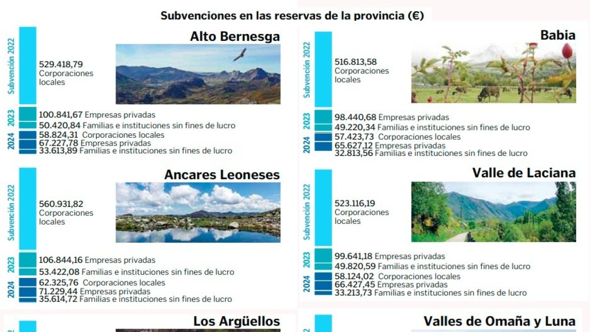 La Consejería de Fomento y Medio Ambiente de la Junta ya tiene elaborada la orden que define el reparto de fondos europeos del Plan de Recuperación entre seis de las reservas de la biosfera de Castilla y León, una propuesta que destina a la provincia de León el 57 por ciento de los recursos previstos hasta 2024. Concretamente, la orden consigna a nueve espacios protegidos por la Unesco en la Comunidad un total de 8,9 millones de euros de los que más de 5 millones se distribuirán entre las reservas leonesas. Los espacios beneficiados son Alto Bernesga, Ancares Leoneses, Valle de Laciana, Valles de Omaña y Luna, Los Argüellos y Babia en la provincia de León, Sierras de Béjar y Francia en Salamanca, Meseta Ibérica en Salamanca y Zamora y el Real Sitio de San Ildefonso-El Espinar, en Segovia. No entra en este reparto la Reserva de la Biosfera de Picos de Europa, enmarcada en el territorio del Parque Nacional y que recibirá fondos a través de otra vía por esta condición.