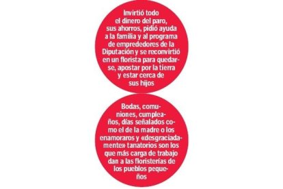 En la floristería no se para. Rosas, lirios, claveles, gerberas inundan de olor y color un espacio y se han convertido en las preferidas de sus clientes a la hora de adornar sus casas o para regalar en días señalados como el de la madre, el de los enamorados, cumpleaños y celebraciones en bodas y comuniones. «Los mayores trabajos que hacemos en las floristerías de los pueblos son para los tanatorios, desgraciadamente, pero también hacemos adornos florales por encargo para adornar las casas y en el día de los enamorados, por ejemplo».