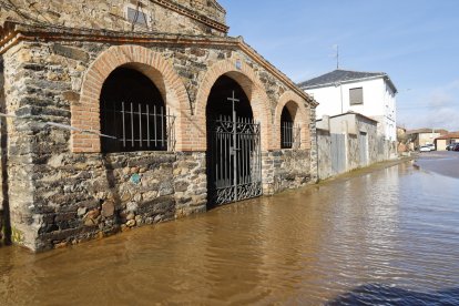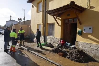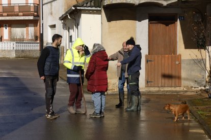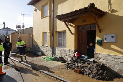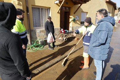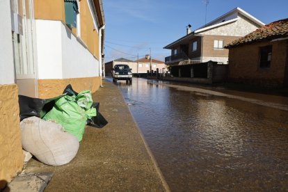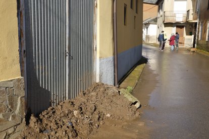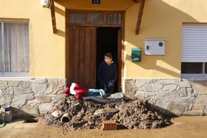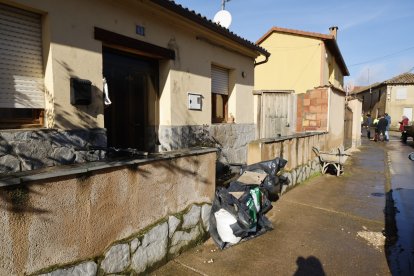 Una madre y su hijo, tras el dique que han levantado parfa evitar la entrada de agua y barro en su casa en Castrillo de Cepeda.