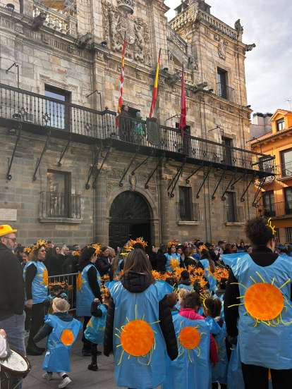 Alumnos y alumnas de los centros González Álvarez, Santa Marta, Blanco de Cela, La Salle, Escolapias, Cosamai, Santa María Madre de la Iglesia y Paula Montal llenaron la plaza con disfraces, música y una energía contagiosa. Todos ellos fueron los encargados de leer el pregón que da inicio a las fiestas, convirtiéndose en auténticos protagonistas del carnaval astorgano.